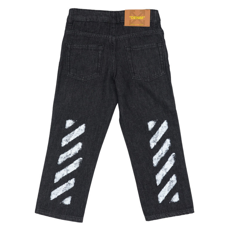 These black denim Off-White kids' jeans feature a classic five-pocket design and a straight leg cut. They are finished with a recognizable white brand patch on the front pocket for a stylish touch.