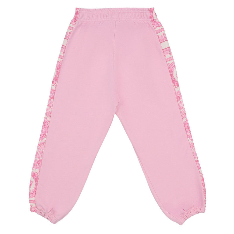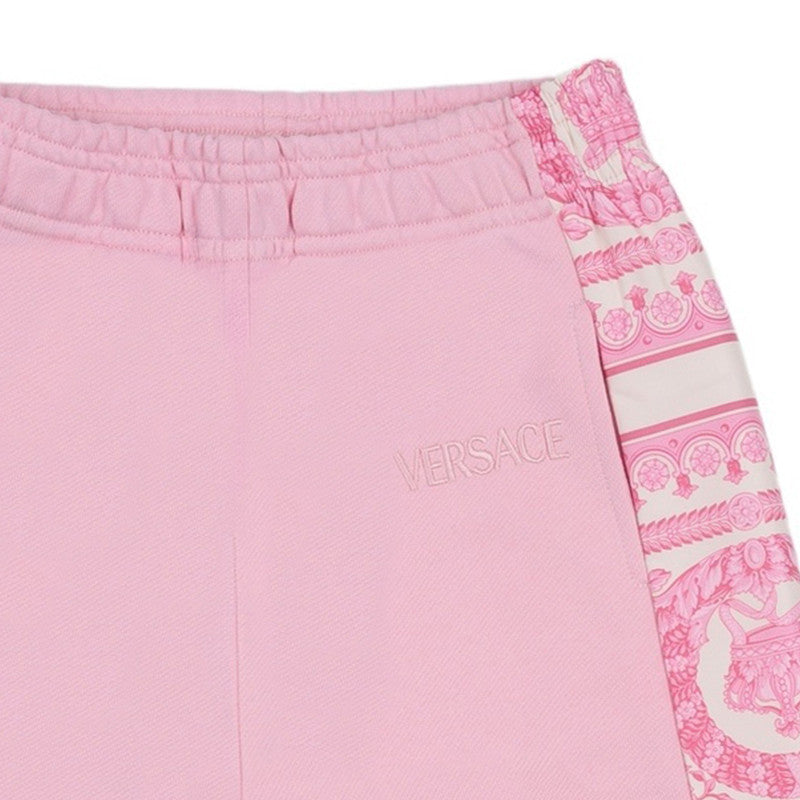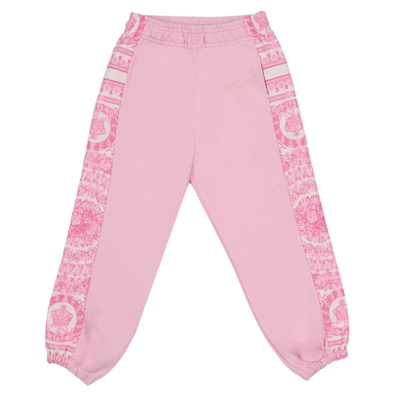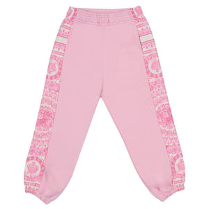 These pale pink joggers are unmistakably by luxury Italian brand Versace, combining a sporty look with designer style. Made in soft, comfortable cotton jersey, they have silky side panels patterned with the brand's iconic Barocco Foulard design in pink and ivory.