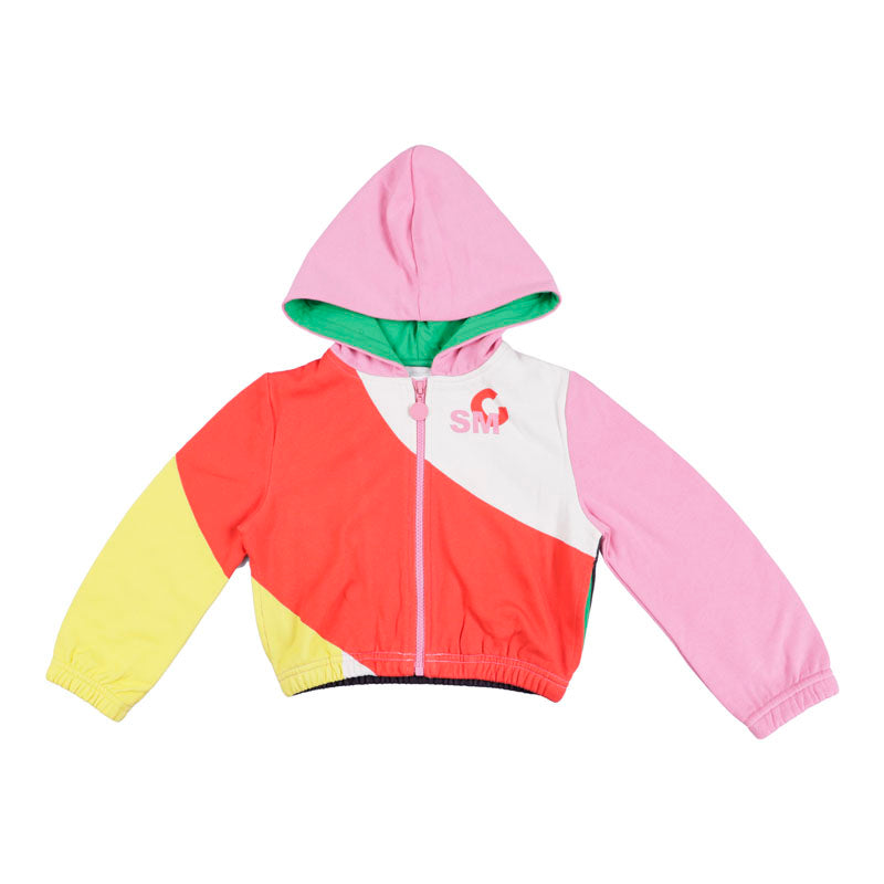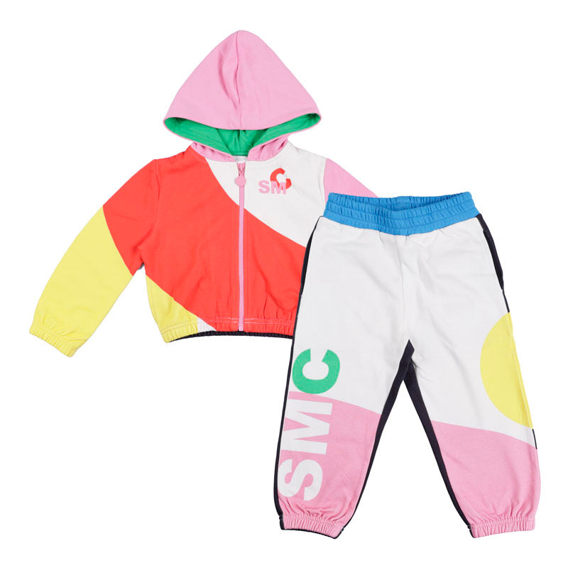 A colourblock tracksuit for girls by Stella McCartney Kids, made in organic cotton jersey with a fleecy inside. In tones of pink, red, white, green, yellow and black, the zip-up hooded top has logo detailing on the chest and an elasticated hem for comfortable wear. The matching joggers have an elasticated waistband with stretchy ankle cuffs. There are concealed side pockets for carrying essentials.