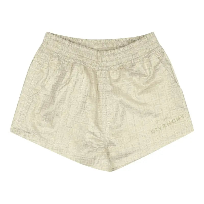 Mini-me, gold jacquard shorts for girls by Givenchy. Made in a soft, lightweight cotton blend and fully lined for comfort, they have a 4G logo pattern that catches the light beautifully. The waistband is elasticated for easy pull on and they have practical front and back pockets. The stylish look is complete with an embroidered logo on the front.