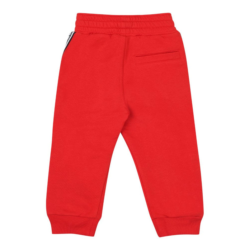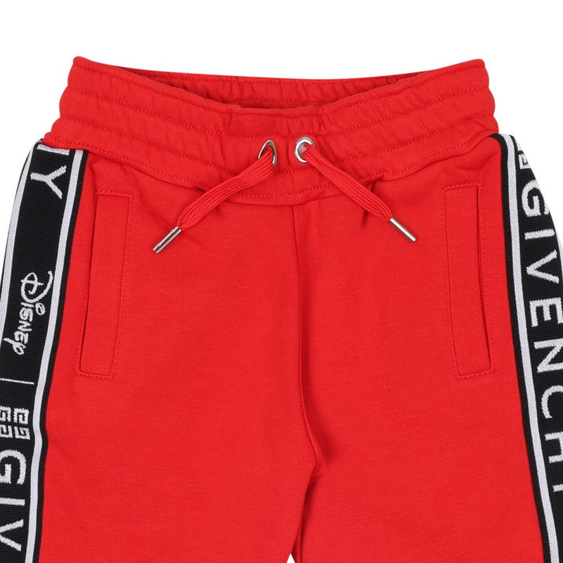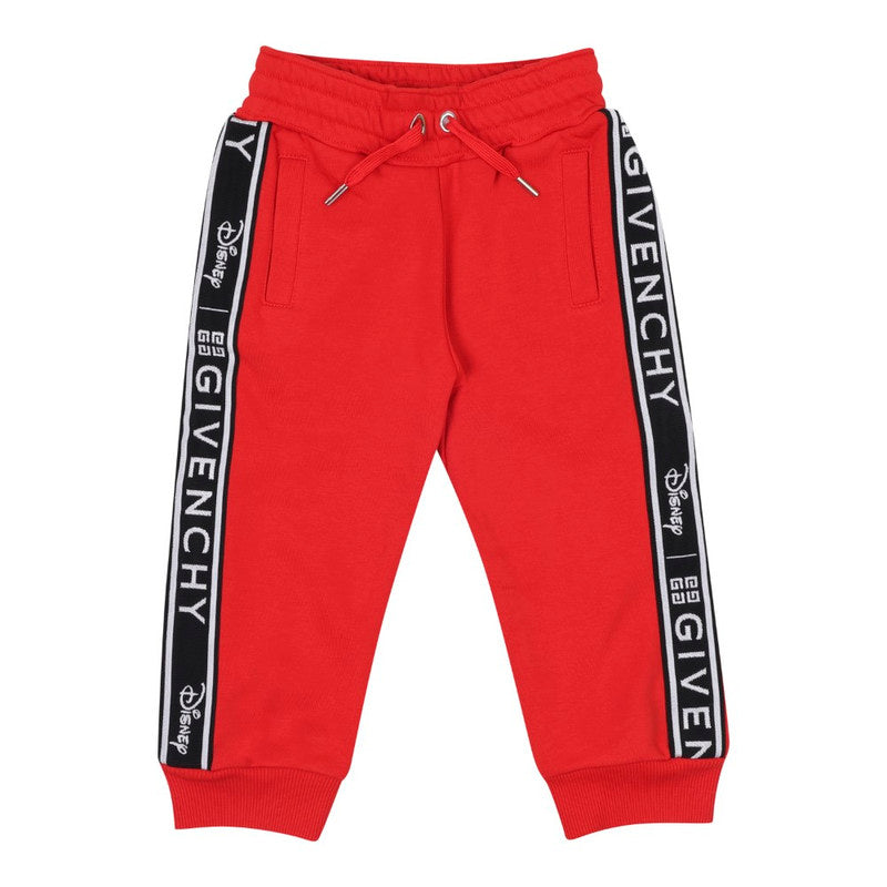 Disney logo-tape track pants from Givenchy Kids featuring bright red, black/white, cotton blend, jersey fleece, jacquard logo motif, logo-tape detailing, side stripe detailing, elasticated drawstring waistband, two side inset pockets, rear welt pocket and ribbed ankles.