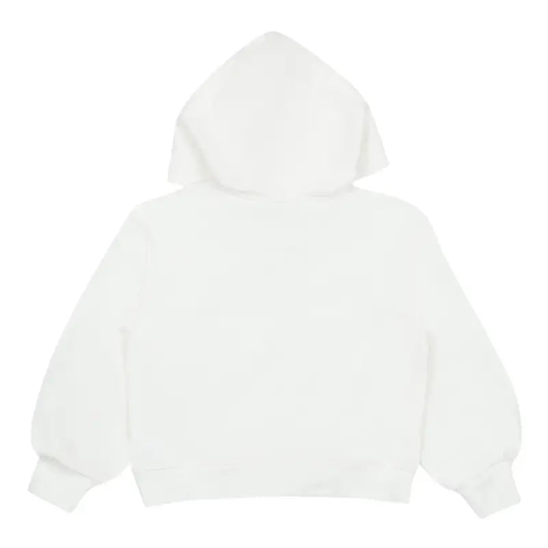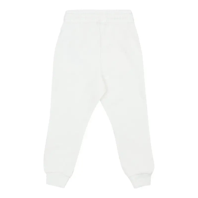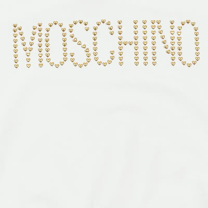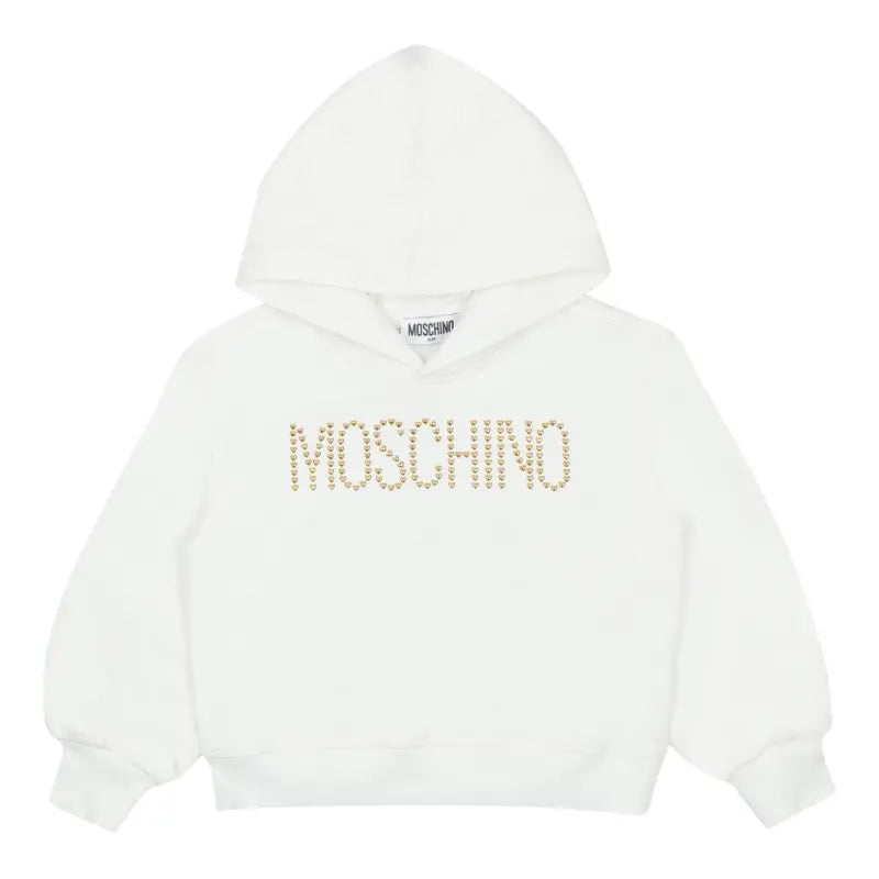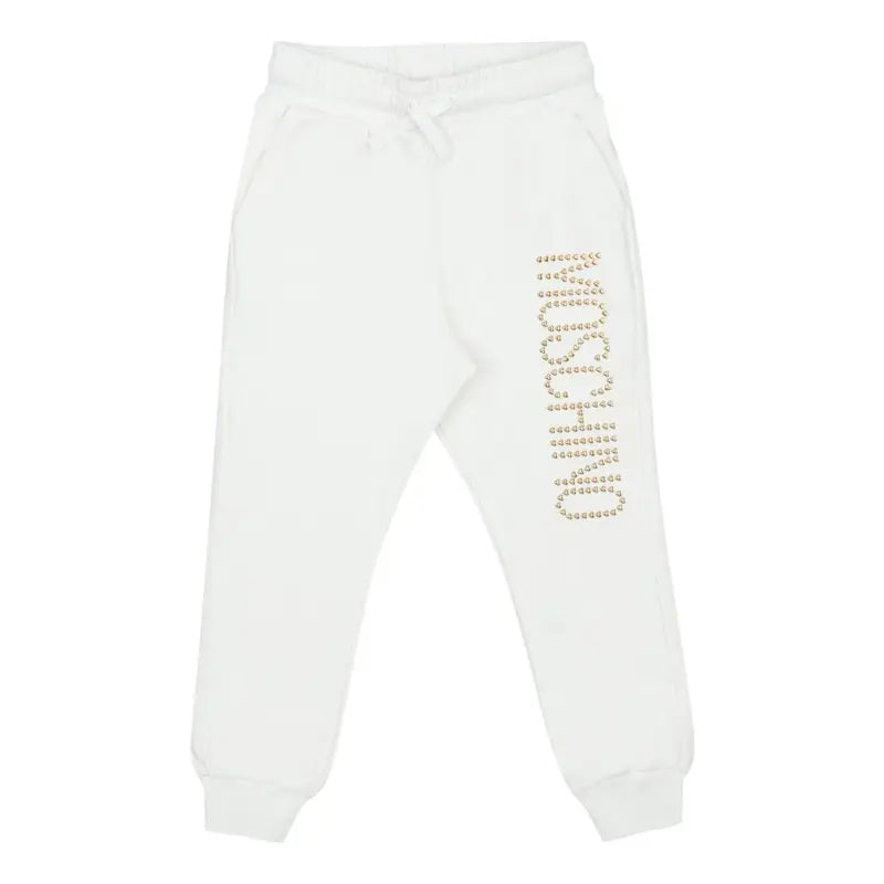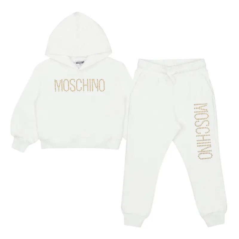 An ivory cotton tracksuit by luxury Italian brand Moschino Kid-Teen. This casual ensemble is made in comfortable jersey with ribbed trims and golden, heart-shaped studs forming a bold logo on both pieces.