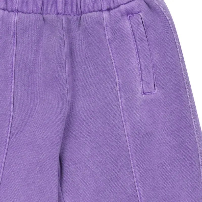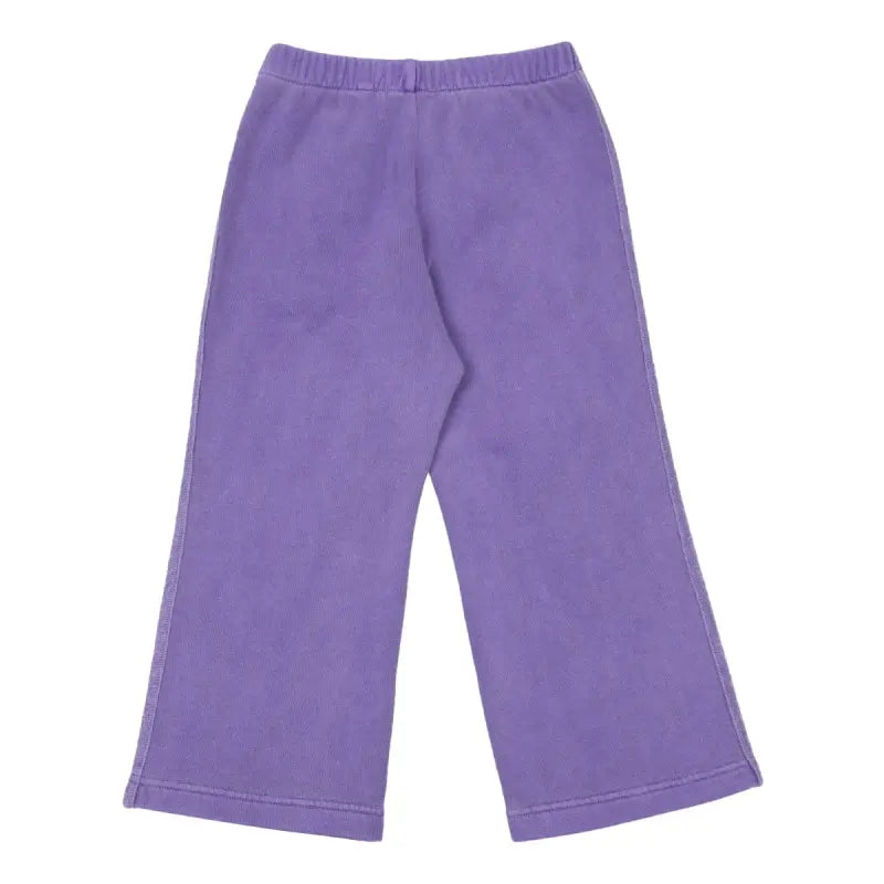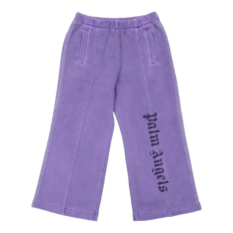 Softly punk and with new over logo. Girls' purple shaded travel pants with cut-and-sew pattern and new Palm Angels over logo printed in purple vertically on left leg.