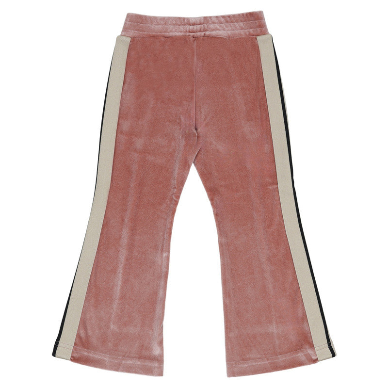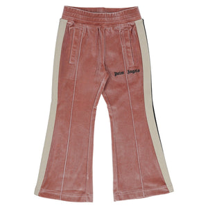 Lightweight pink velour joggers by Palm Angels, with a sheen. These soft, velvety trousers have an elasticated waistband with stitched front seams, useful front pockets and a slight flare. The brand's gothic-style logo is embroidered on one leg, whilst the signature, stylish side stripes are in beige and black.