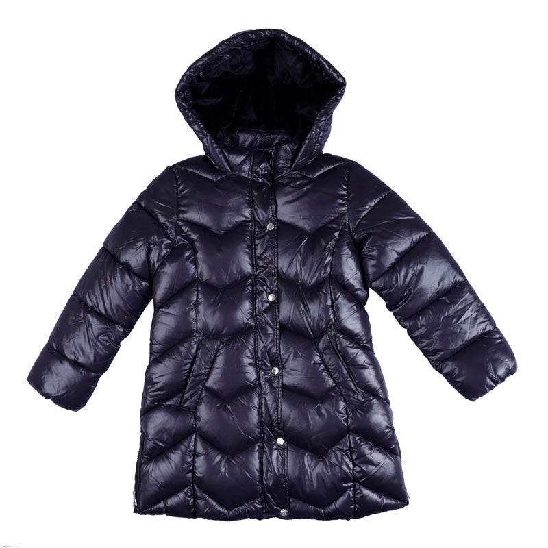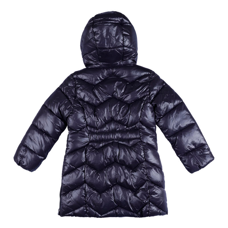 Filling of the ECOFRIENDS garment 100% recycled polyester. Long sleeved coat for girl. Hooded design. Front zip fastening with snap-buttons. 100% Polyamide