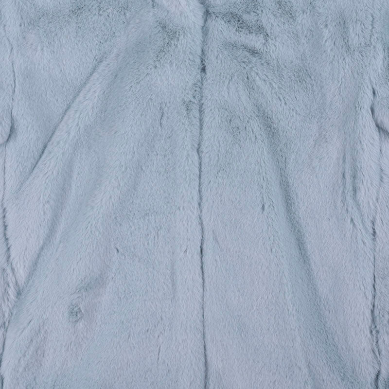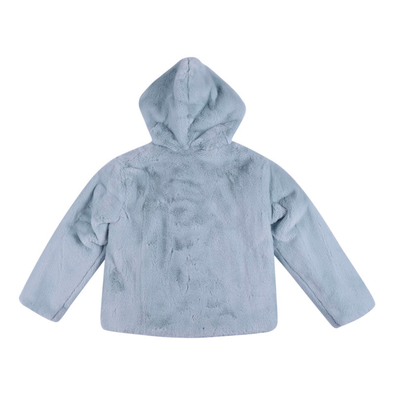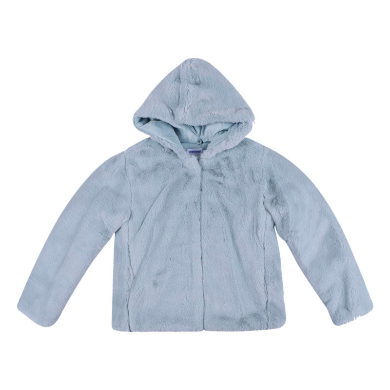 Filling of the ECOFRIENDS garment 100% recycled polyester. Long sleeved coat for girl. Hooded collar. Fastening with hidden clasps which allow the item to be put on easily. Soft and smooth outer faux fur fabric. 100% Polyester