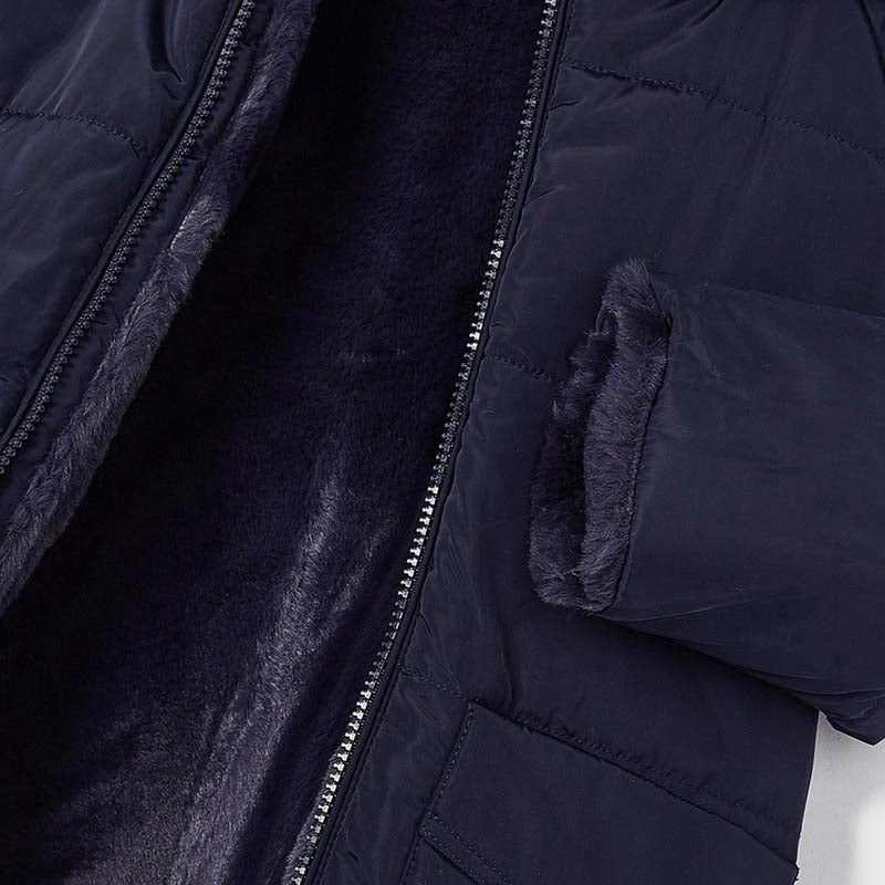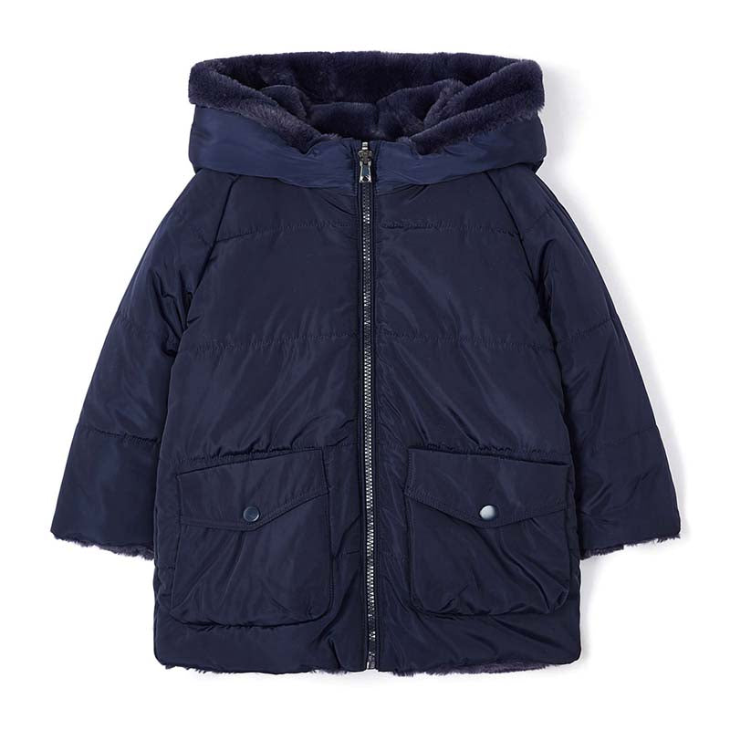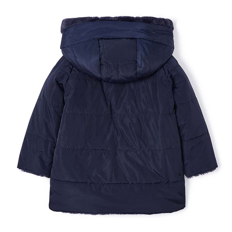 Filling of the ECOFRIENDS garment 100% recycled polyester. Long sleeved coat for girl. Hooded design. Front, central zip fastening. 100% Polyester