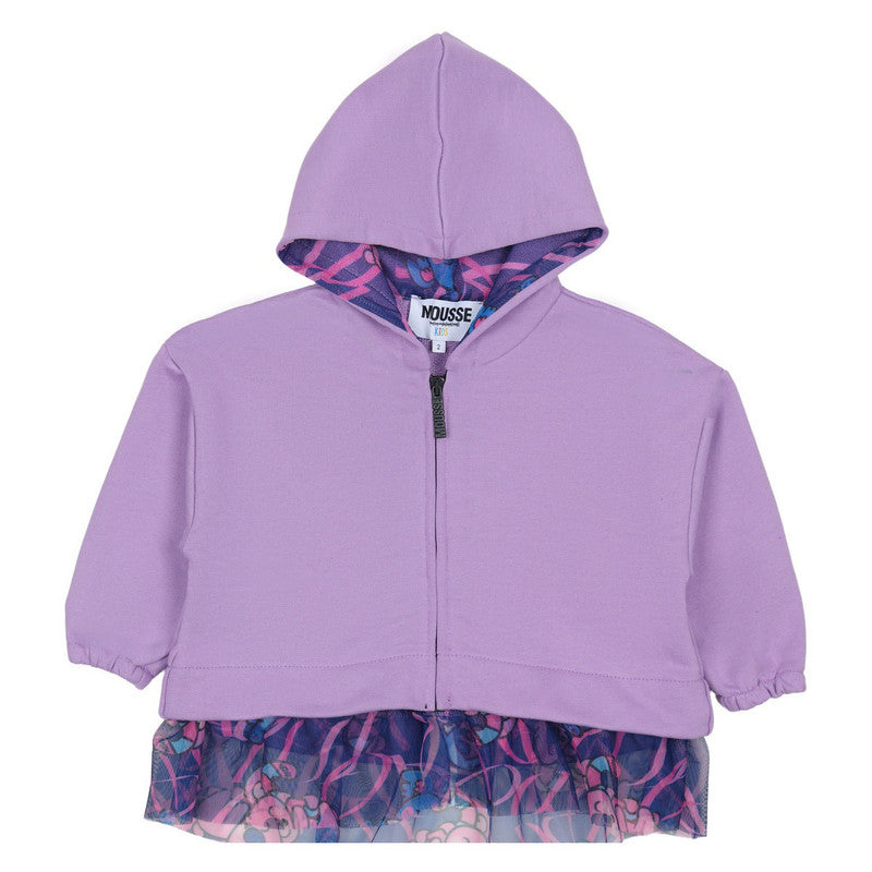 The Mousse Lilac Koala Tulle Hoodie is an adorable style statement. This lilac cotton jacket features a cozy hood and is beautifully finished with a vibrant, flared tulle hem for a fun, layered look.