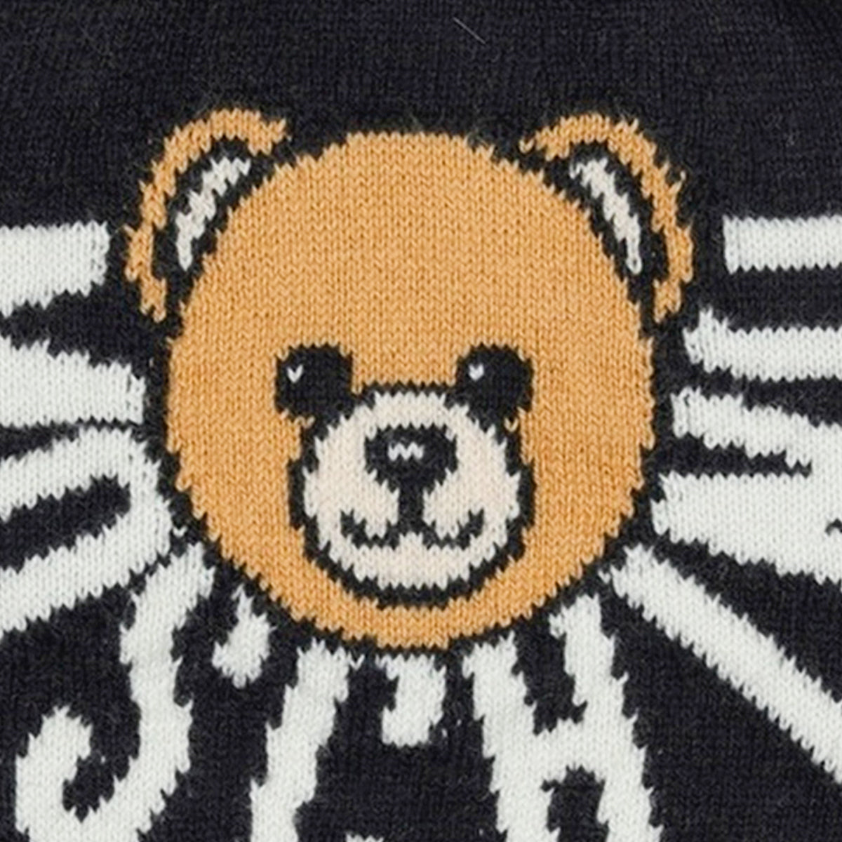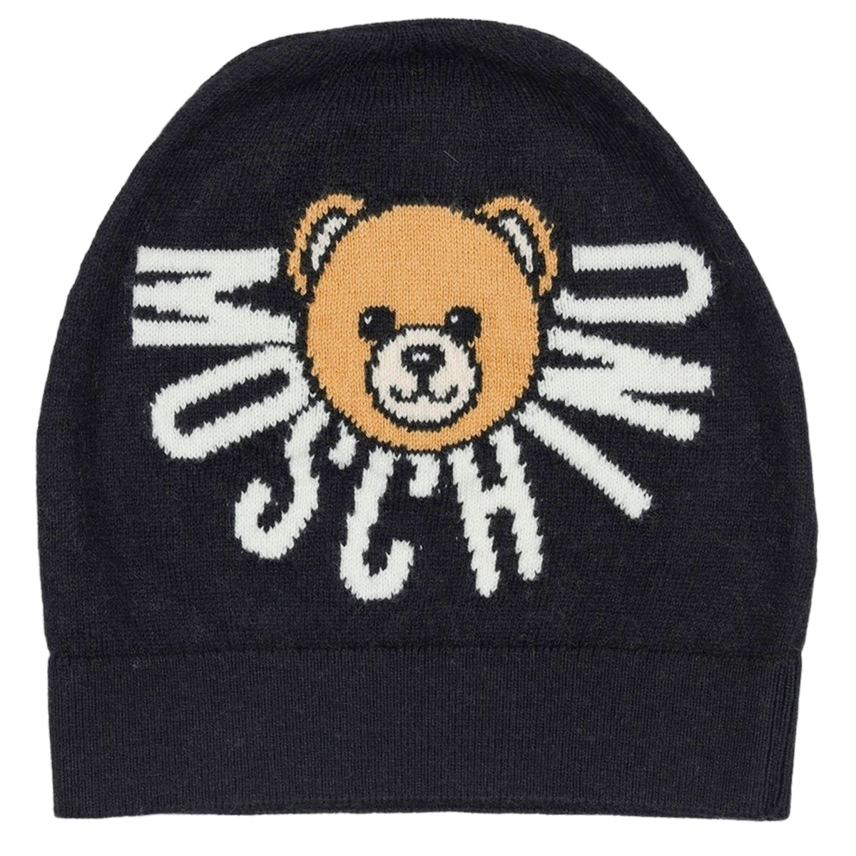 Keep Your Little One Cozy And Stylish With This Black Beanie From Moschino Kids, Featuring The Brand’S Signature Teddy Bear Embellishment. Designed With A Ribbed Brim For A Snug Fit, It Also Showcases A Subtle Logo Embellishment, Adding A Playful Yet Iconic Touch To Their Cold-Weather Wardrobe.