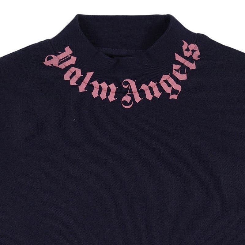 Give their wardrobe a luxurious edge with the Palm Angels Neck Logo Sweatshirt. This navy pullover boasts the brand name in a cool pink gothic font around the mock neck. It's premium fleece for a bold, cozy statement.