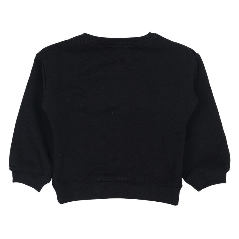 This stylish Mousse black sweatshirt features a cozy fleece interior, a playful embroidered apple graphic, and a horizontal band of dazzling black sequins across the chest.