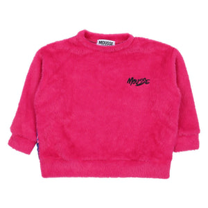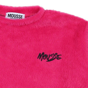 Turn heads with this Mousse hot pink fuzzy sweatshirt! Featuring a cozy faux-fur texture and a black embroidered logo, it delivers a comfortable, vibrant statement look.