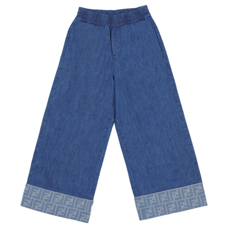 Fashionable blue wide-leg denim trousers featuring a ruched elastic waist and statement cuffs with the classic Fendi FF monogram print.