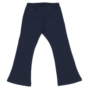 Navy blue trousers by luxury Italian label, Versace, made in soft cotton jersey. These comfortable pull-on trousers have an elasticated waistband and a flared fit. For instant brand appeal, a bold logo is printed down one leg in silver glitter for a sparkly finish.