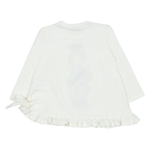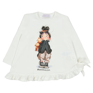 Combining playful charm with comfort, this ivory and black leggings set is by Monnalisa. Made in soft cotton jersey, the tunic top features a delightful graphic of a girls holding a teddy bear, with a ruffled hem and bow detail adding a sweet touch. The leggings have a comfortable elasticated waist and feature a cute teddy and heart pattern.