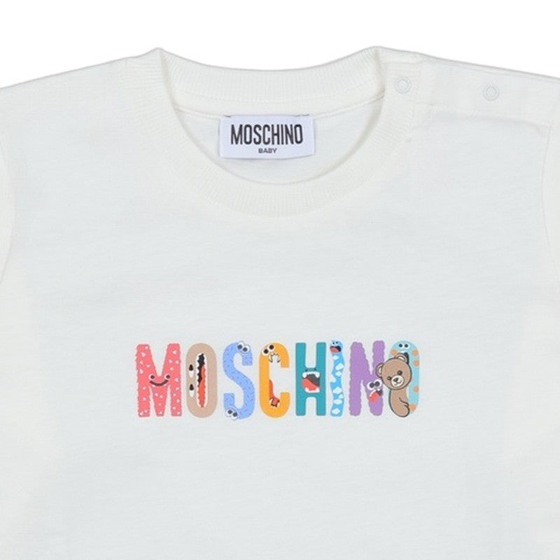 This Crisp Moschino Long-Sleeve T-Shirt In Ivory Features A Fun, Colorful Logo Where Each Letter Is Creatively Illustrated With The Moschino Teddy Bear And Friends. A Playful Cotton Essential.