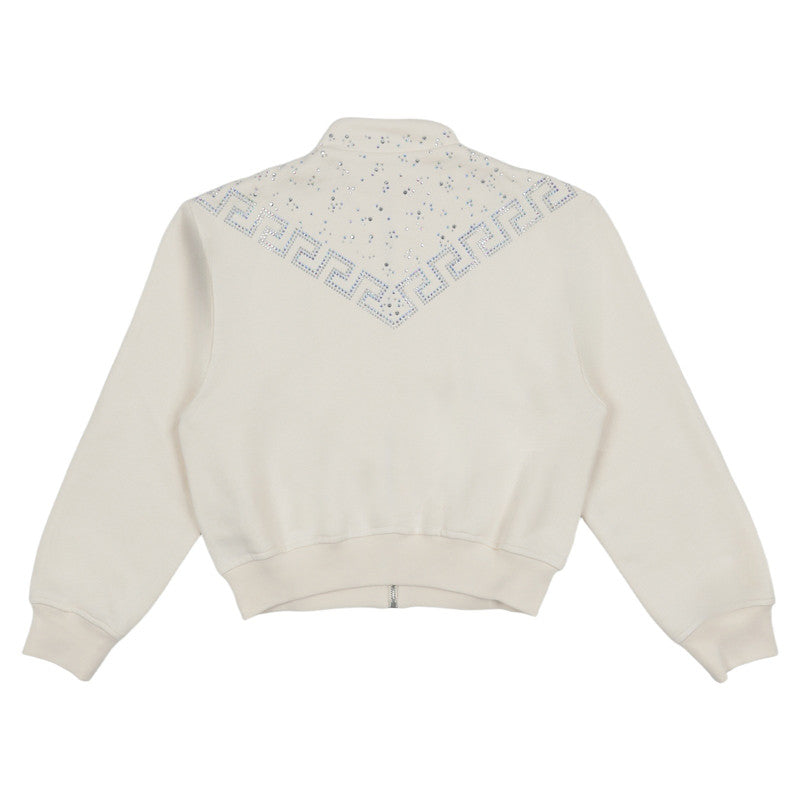 Ivory zip-up top by luxury Italian label Versace, combining comfort and style. Made in soft, mid-weight cotton jersey, it has comfortable ribbed trims and practical side seam pockets. It is beautifully embellished with the distinctive Greca design in iridescent diamantés and silver studs, and the zip pull features the Medusa logo for a stunning designer finish.
