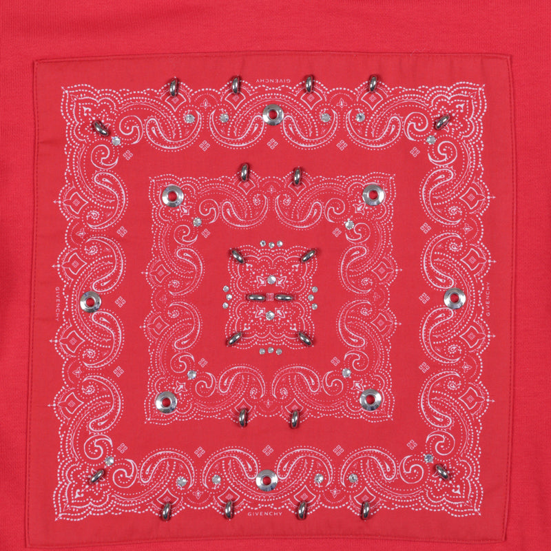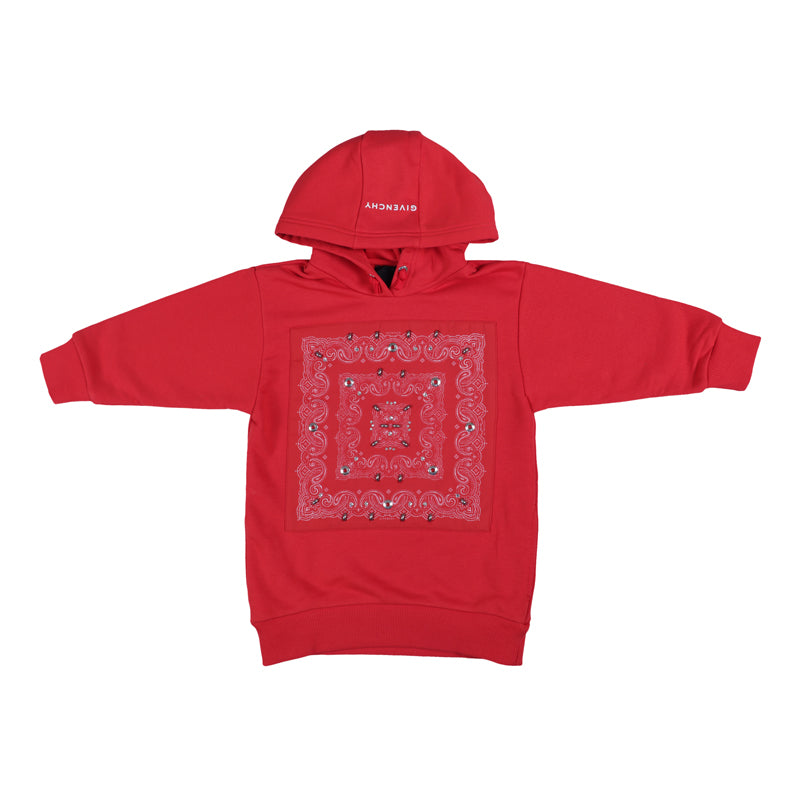 Long sleeve hoodie dress from Givenchy Kids featuring bandana print, bright red, cotton-blend, classic hood, long sleeves and knee-length. Fabric: Cotton 86%, Polyester 14%