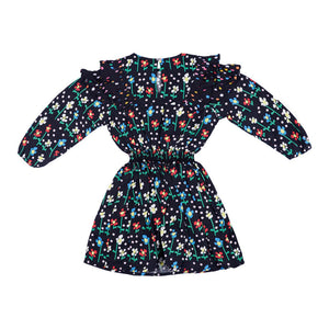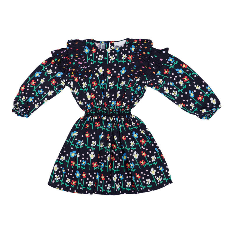 Dotty Daisies dress with a ruffle detail by Stella McCartney. Dress has a multicolored all-over daisy print on a black base, key-hole closure and elasticated cuffs and waistband.
