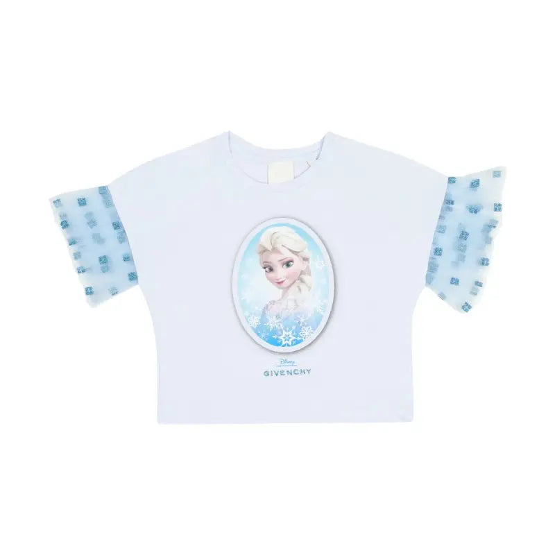 Designed in collaboration with Disney, this pale blue cotton T-shirt for girls is from luxury French brand, Givenchy. Made in soft jersey, the front features magical ice princess Elsa, together with glittery logo embroidery. Disney's iconic castle is printed on the back with matching glittery logo detail. Designed with a relaxed fit, the T-shirt has dropped shoulders and ruffled short sleeves in fine tulle, with glitter logos for a sparkly designer finish.