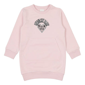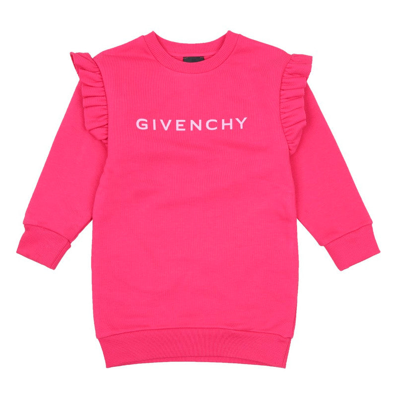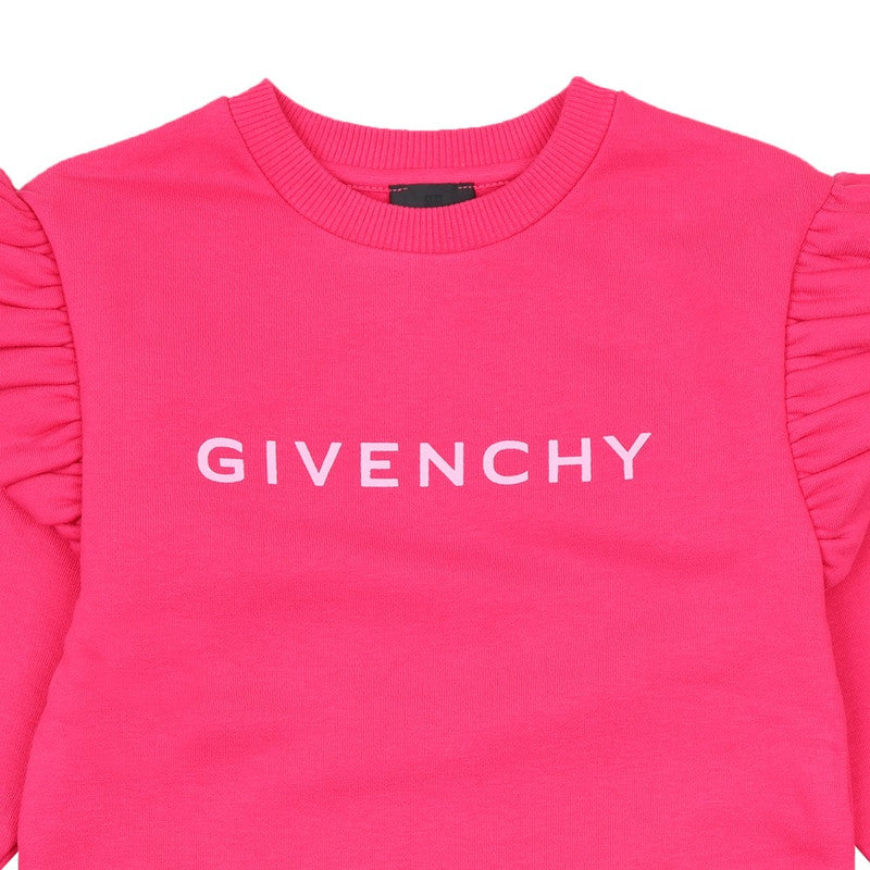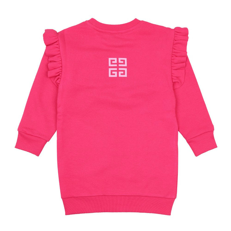 From Givenchy, a fuchsia pink cotton sweatshirt dress for girls with fun frills over the shoulders. Made in comfortable cotton jersey with a soft brushed feel inside, it has gently ribbed trims and concealed side pockets. Adding a distinctive designer finish, there is a contrasting pink logo print across the chest and a recognisable 4G logo on the back for added impact.