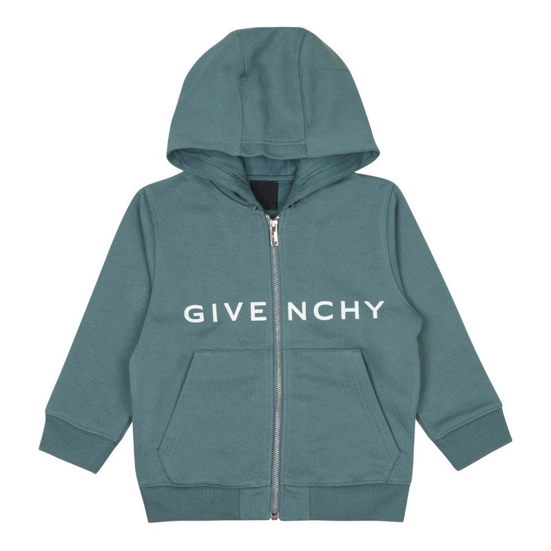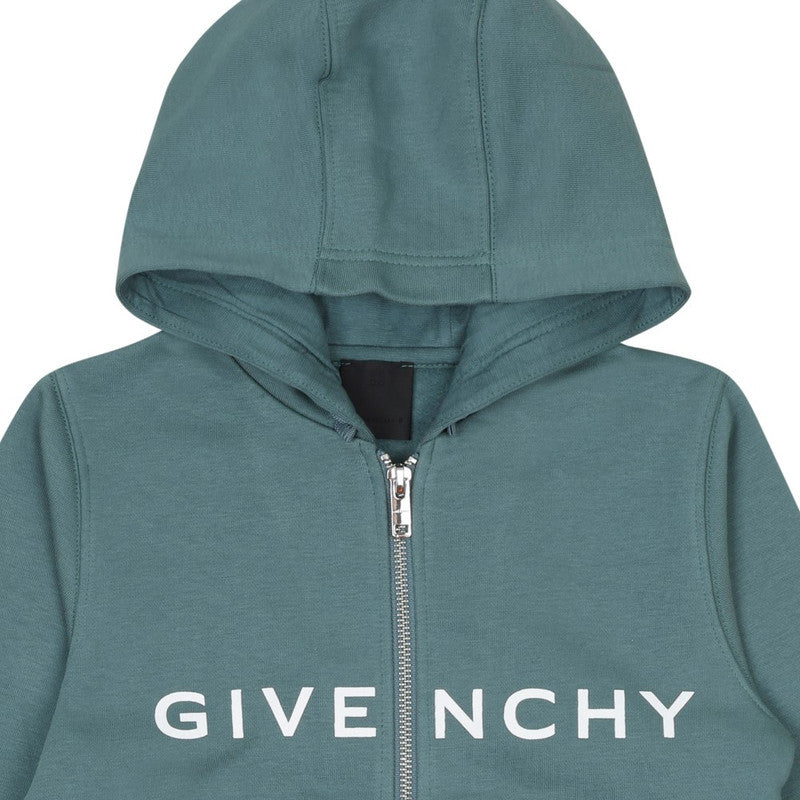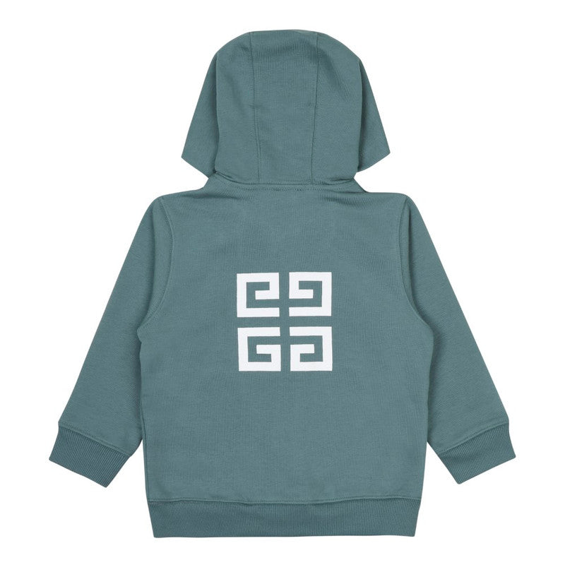 Mini-me sea green zip-up top for boys from brand Givenchy. Made in comfortable, mid-weight cotton jersey, it is hooded with ribbed trims and large front pockets for a classic finish which helps keep the warmth in. A large white logo print across the front and the iconic 4G on the back give a designer touch.