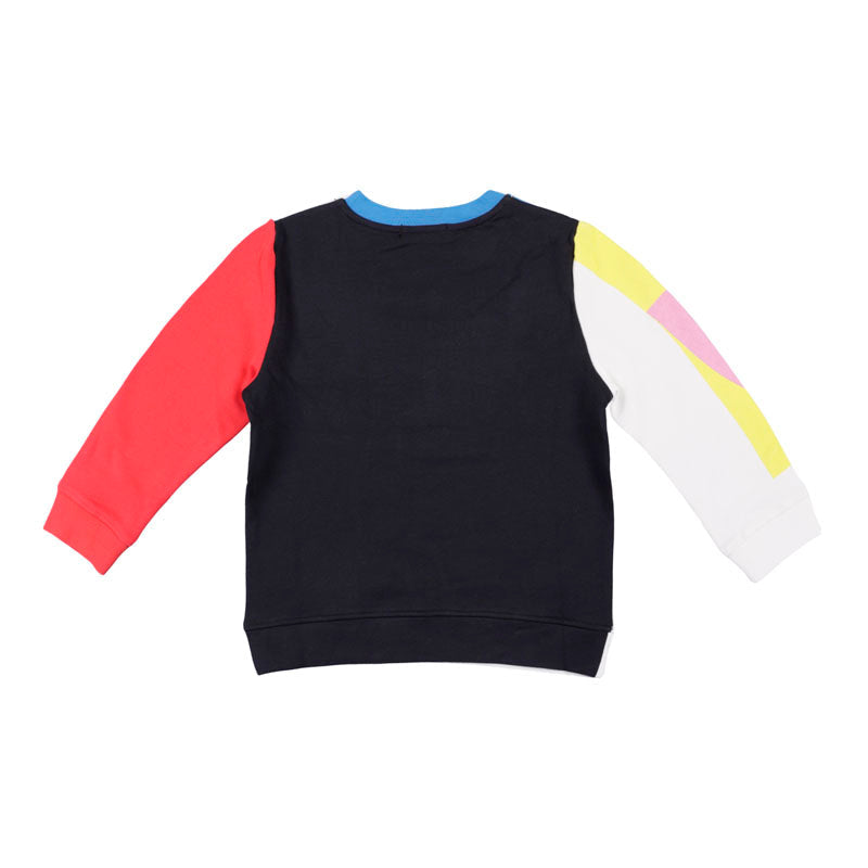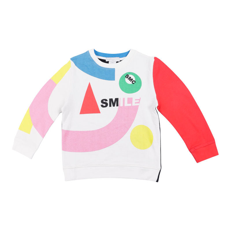 Ivory and black logo sweatshirt for girls by Stella McCartney. Made from soft cotton, it features the brands logo initials, slogan and colorful shape print on the front and black panel at the back.