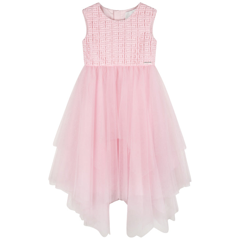 Light pink jacquard tulle dress from Givenchy Kids featuring jacquard logo motif, tulle overlay, round neck, sleeveless, rear zip fastening and asymmetric hem.