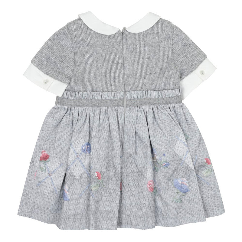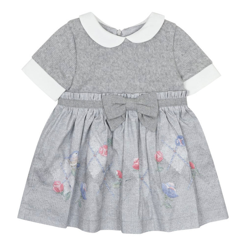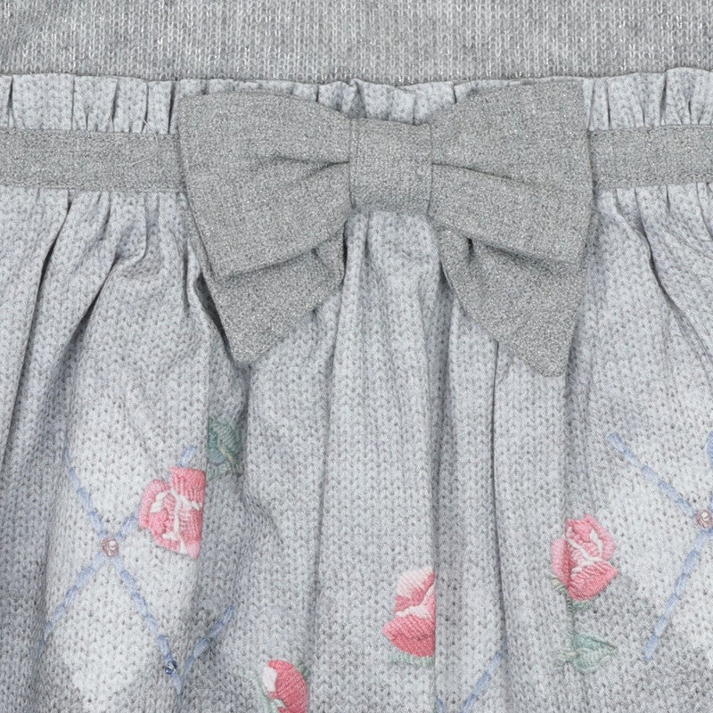 A delightful grey dress for girls by Lapin House. The bodice is knitted with a touch of silver sparkle and white twill trims. The woven skirt has a unique argyle knit effect print with flower and bird motifs and sparkly diamantés. It is ruffled and gathered around the waist with a shimmery grey bow trim on the front. For added comfort, the dress has a lightweight cotton lining and a practical zip to fasten seamlessly on the back.