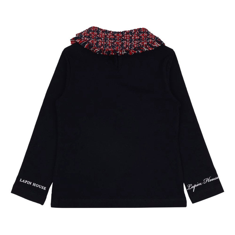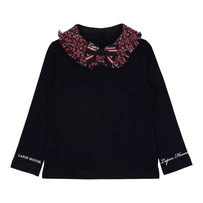 A navy blue top for girls from Lapin House, made in soft and stretchy cotton jersey. It has a lovely red, blue and white tweed collar, with fringed edges and a branded, striped grosgrain bow. A popper fastening on the collar allows for ease when dressing. White glitter logo prints can be found above the cuffs to complement the design.