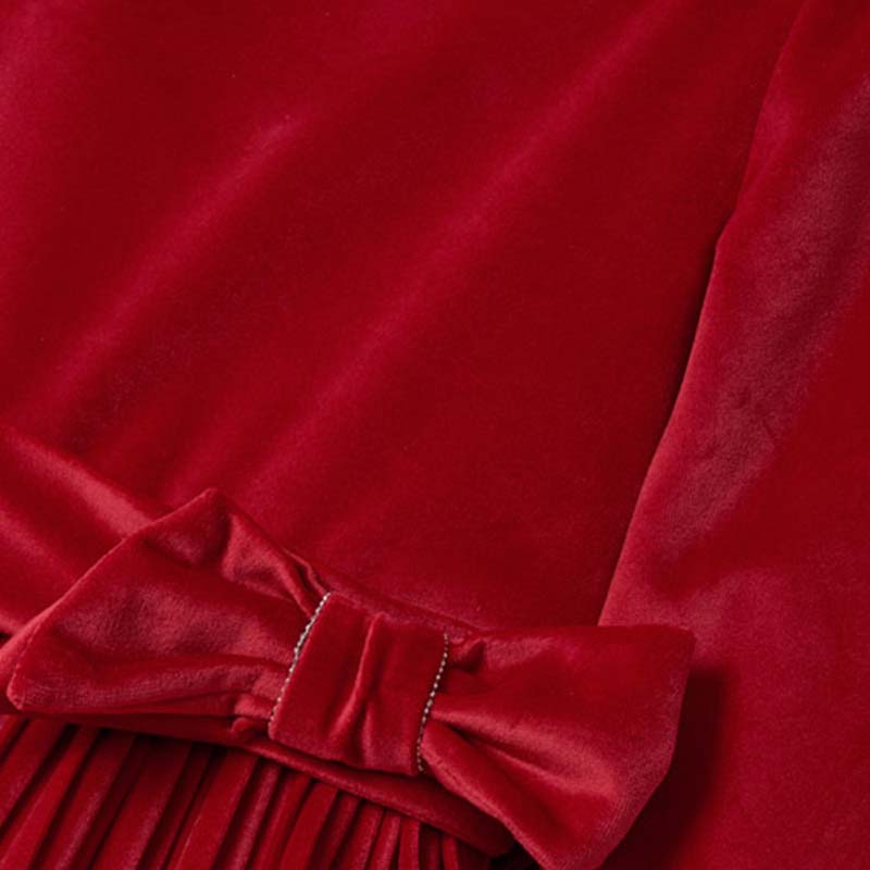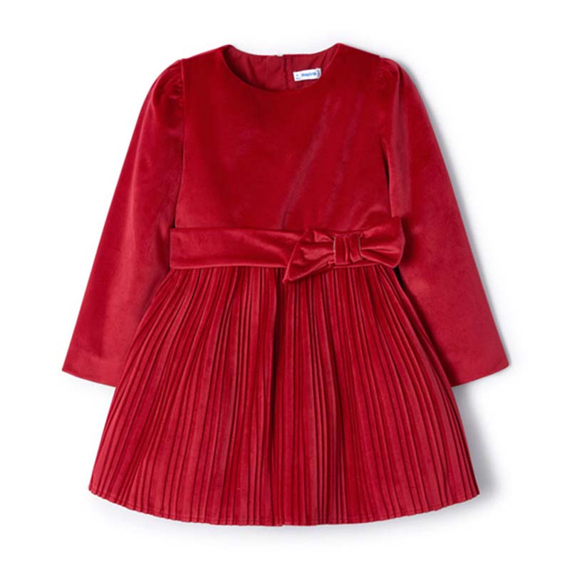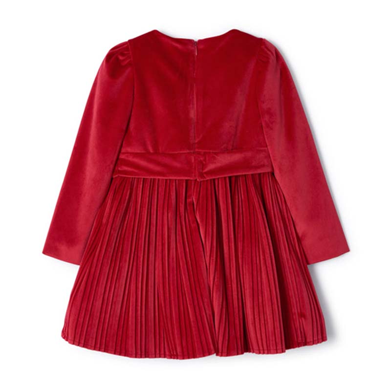 Mayoral Velour Dress with waist bow detail and pleated full skirt. Long sleeve with zip fastening on back. Perfect party dress.