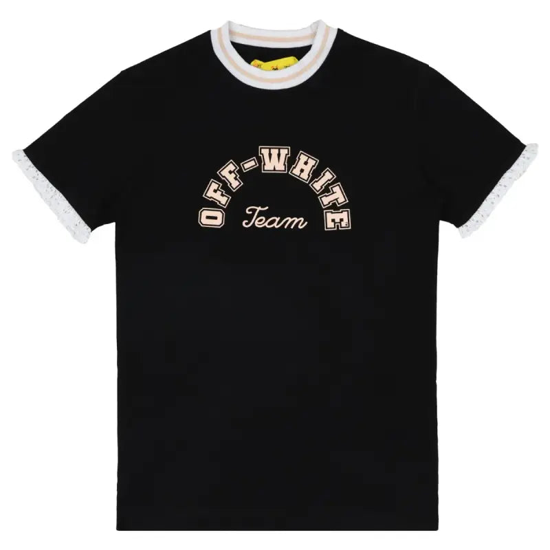 Off-White's penchant for logomania is apparent on this dress from its SS24 Kids' collection. Crafted from black organic cotton with contrasting white lace trims, it's accented with the brand's logo at the front and back in a light-pink hue