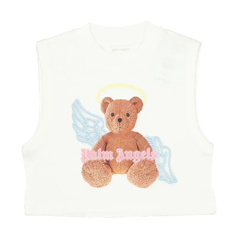 Girl'S White Cropped Tank Top With Neon-Blue Winged Teddy Bear And Pink Palm Angels Logo Printed On Front.