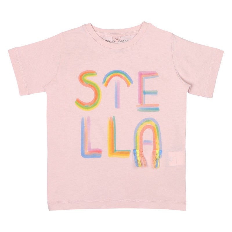 Pink t-shirt for girls by British designer Stella McCartney. Made from soft organic cotton jersey, it has the brands logo in a bright and colorful rainbow print with a matching fringe trim on the front.