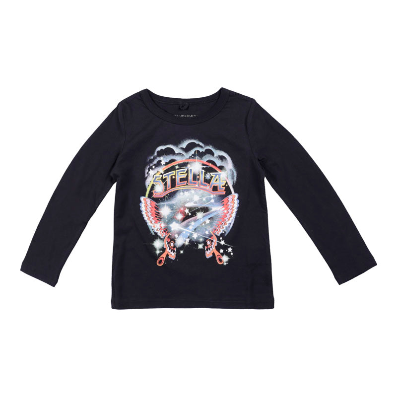 Black T-shirt for girls by Stella McCartney with playful intergalactic butterfly print on the front.