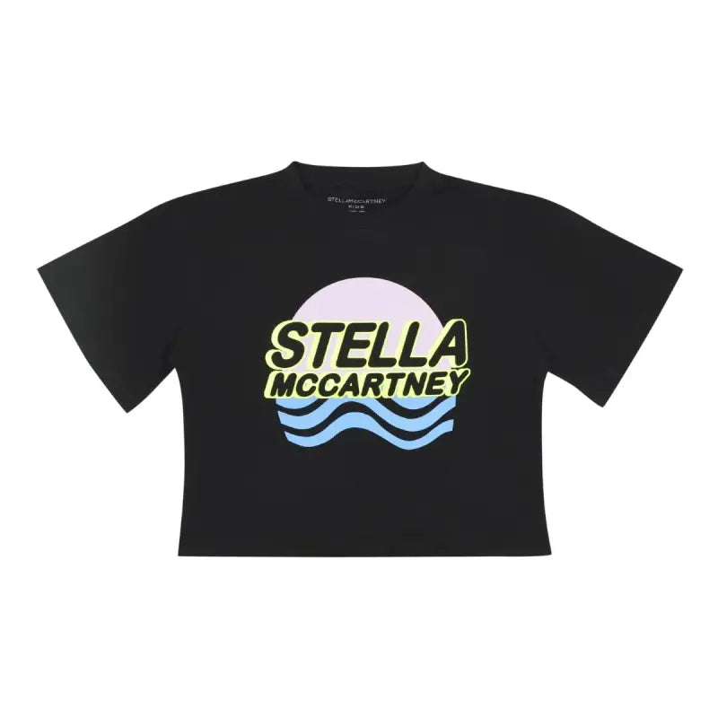 Black t-shirt for girls by Stella McCartney. Made from soft organic cotton jersey, it features the brands logo print in purple, neon yellow and blue on the front.