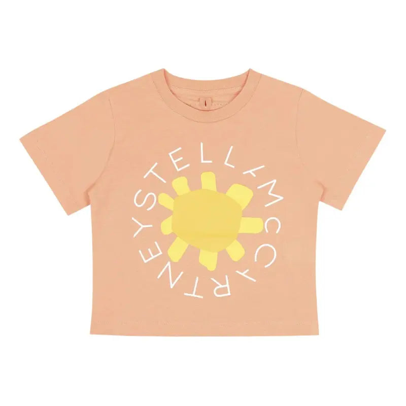 A pale orange T-shirt for girls by Stella McCartney Kids, made from soft organic cotton jersey. Styled with short sleeves and a lightly ribbed crew neck, this casual tee has a yellow sunflower printed on the front, within a bold white circular logo. The Stella McCartney fit can be quite small so choose a size up if you want room to grow.
