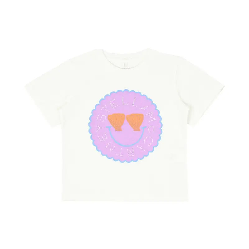 Stella McCartney inspire imagination and creative expression in their colourful designs. This girls ivory t-shirt is reflective of the label's eco-friendly properties and eccentric outlook. Crafted in beautiful organic cotton with a logo, smiley face and shells on the front