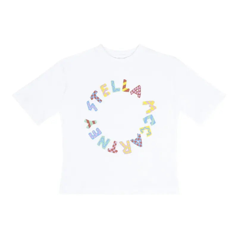 Great for a simple yet branded style, this white short-sleeved T-shirt for girls is by Stella McCartney Kids. Made from soft organic cotton jersey, it is printed with a colourful and abstract patterned logo on the chest for an instantly recognisable look. The Stella McCartney fit can be quite small so choose a size up if you want room to grow.