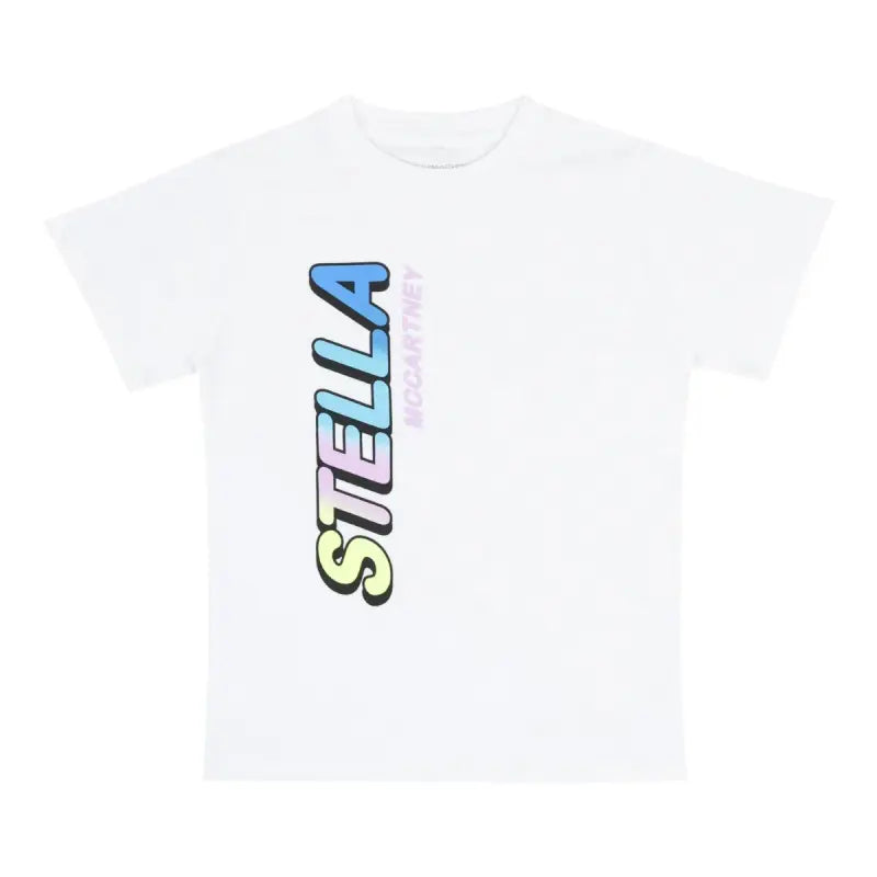 White organic cotton T-shirt for girls by Stella McCartney Kids. Comfortable and casual, this short-sleeved tee is made soft jersey with a distinctive logo motif on the front in gradient blue, pink and yellow shades. The Stella McCartney fit can be quite small so choose a size up if you want room to grow.