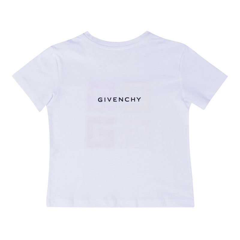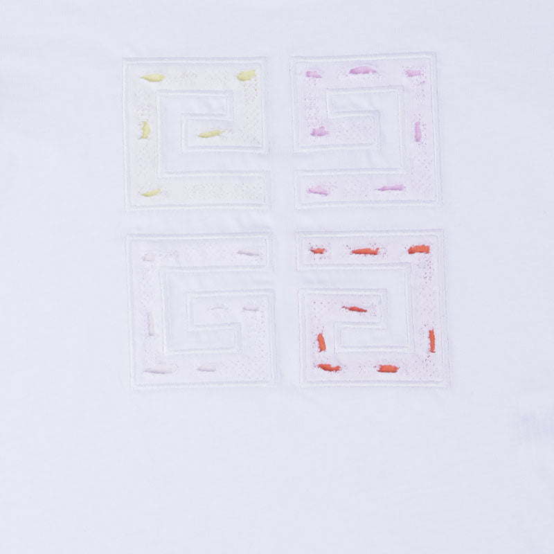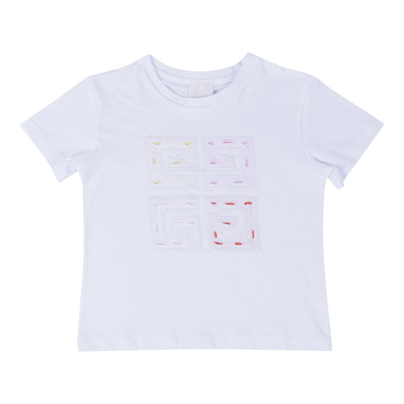 This fresh white T-shirt by Givenchy Kids is given a point of difference thanks to the embroidered 4G emblem at the front, which is detailed with broderie anglaise lace in different pastel hues. A printed logo to the back offers subtle branding to the piece.