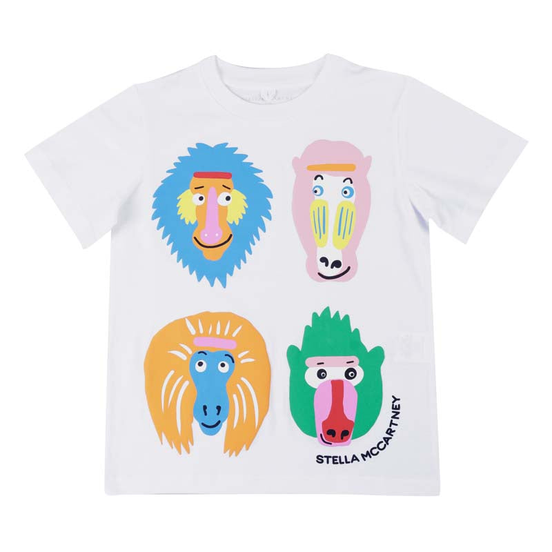 Jolly white organic cotton T-shirt for boys by Stella McCartney Kids, with colourful, smiling monkeys and the designer's logo printed on the front. Made in comfortable jersey, it is ideal for relaxed days.