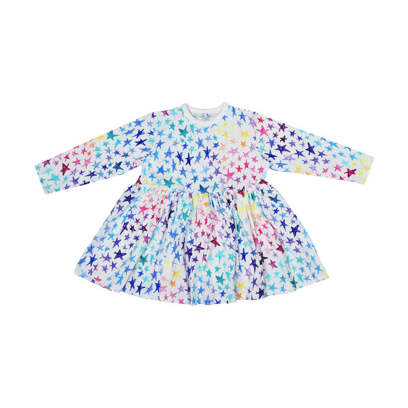 Off-white dress for teen girls by Stella McCartney Kids, printed with doodled stars in shades of blue, pink and yellow. Made in soft and stretchy organic cotton jersey, this comfortable pull-on dress has a rounded neckline and long sleeves. The Stella McCartney fit can be quite small so choose a size up if you want room to grow.