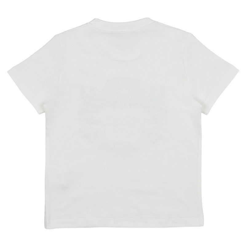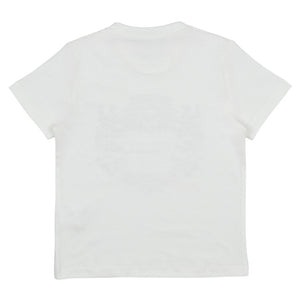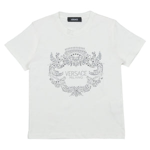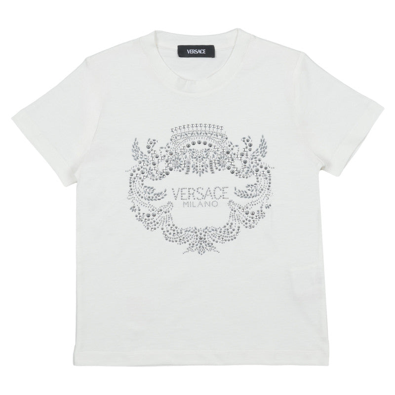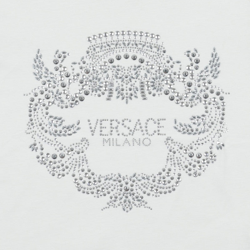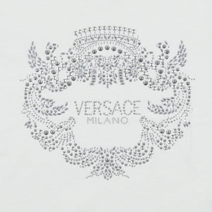 White T-shirt by luxury Italian label Versace, with a silver glittery Milano logo adding designer sparkle. Casual and comfortable, it is made in soft cotton jersey.