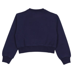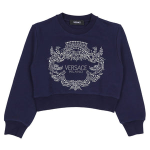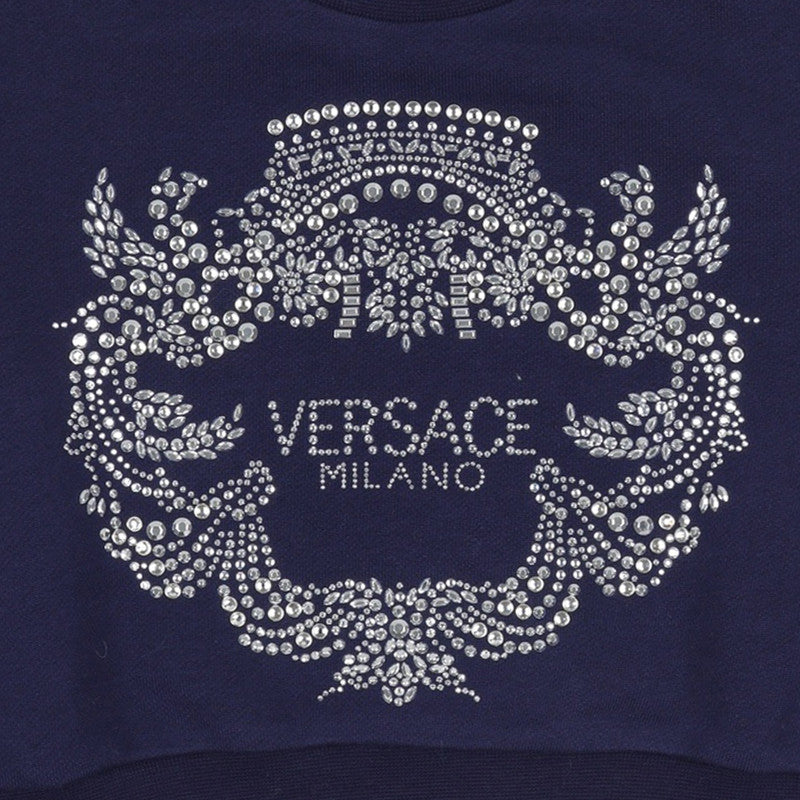 Navy blue sweatshirt by luxury Italian brand Versace, with a sparkling, diamanté-embellished crest logo on the front for instant brand appeal. Casual yet stylish, it is made in mid-weight cotton jersey.