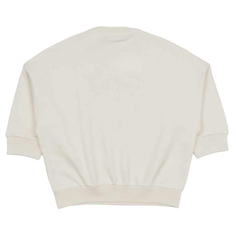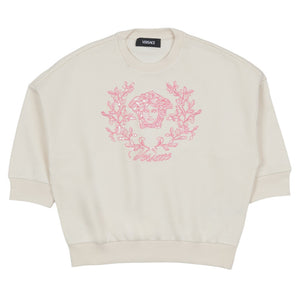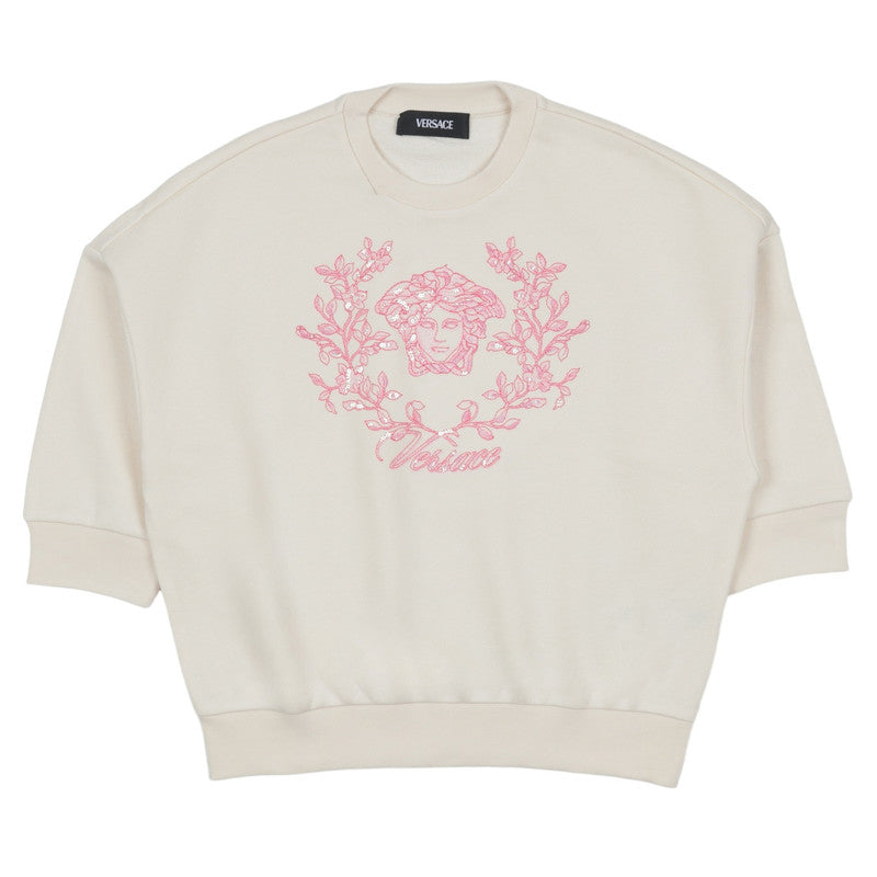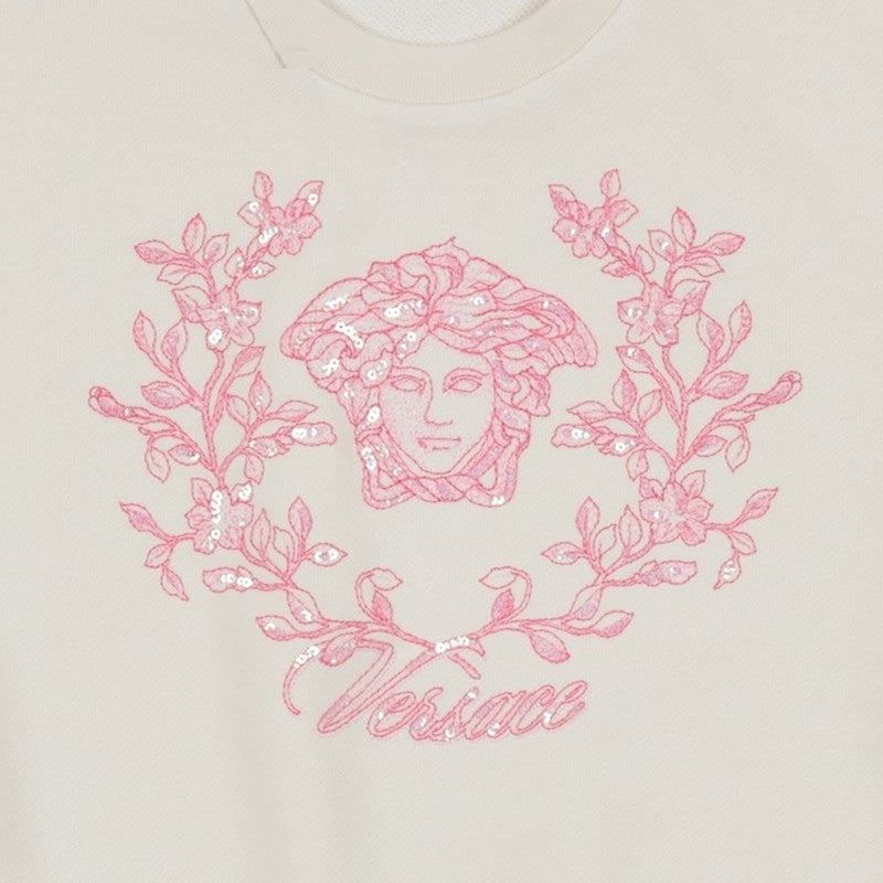 Ivory sweatshirt by luxury label Versace, combining casual style with an iconic designer touch. It is made in mid-weight cotton jersey, with dropped shoulders for a relaxed feel. A Medusa logo with beautiful floral detailing is embroidered on the front in a vibrant pink, with shimmery sequins for added sparkle.