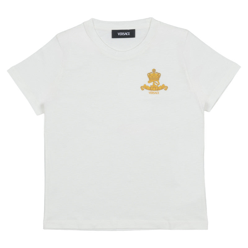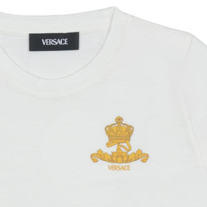 White T-shirt by luxury brand Versace, printed with a distinctive gold crown logo crest on the chest. Casual and comfortable, it is made in soft cotton jersey and styled with a crew neckline.