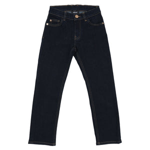 These skinny, dark wash denim jeans feature a thread-embroidered Medusa motif at the back. The five-pocket design is detailed by an accent Medusa button.