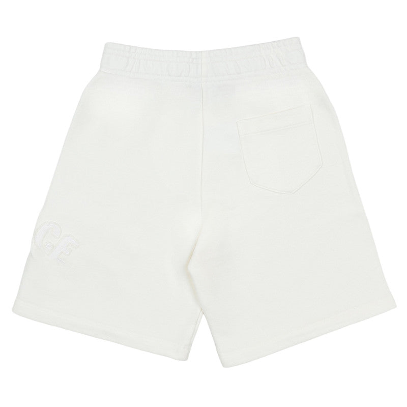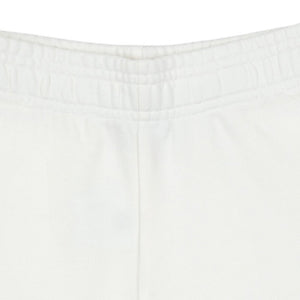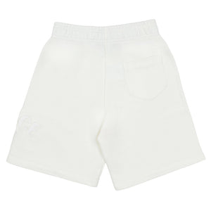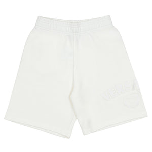 White oversized fit shorts by luxury Italian label Versace, made in soft and comfortable cotton sweatshirt jersey. There is a Versace logo and Medusa stamp in tonal embroidery with cool, frayed edges for instant recognition.