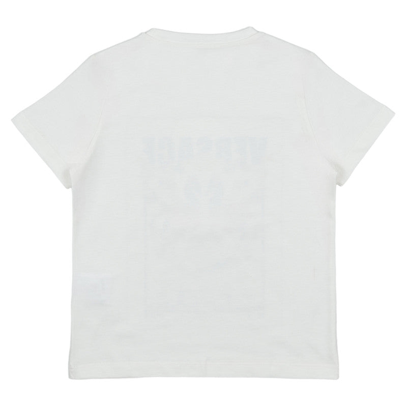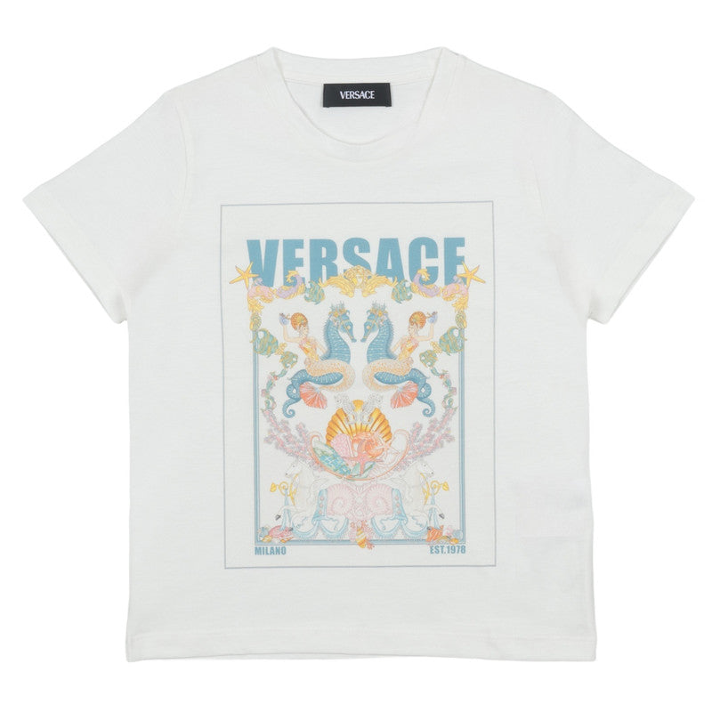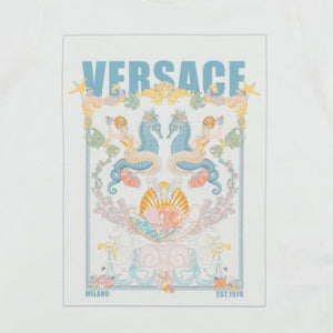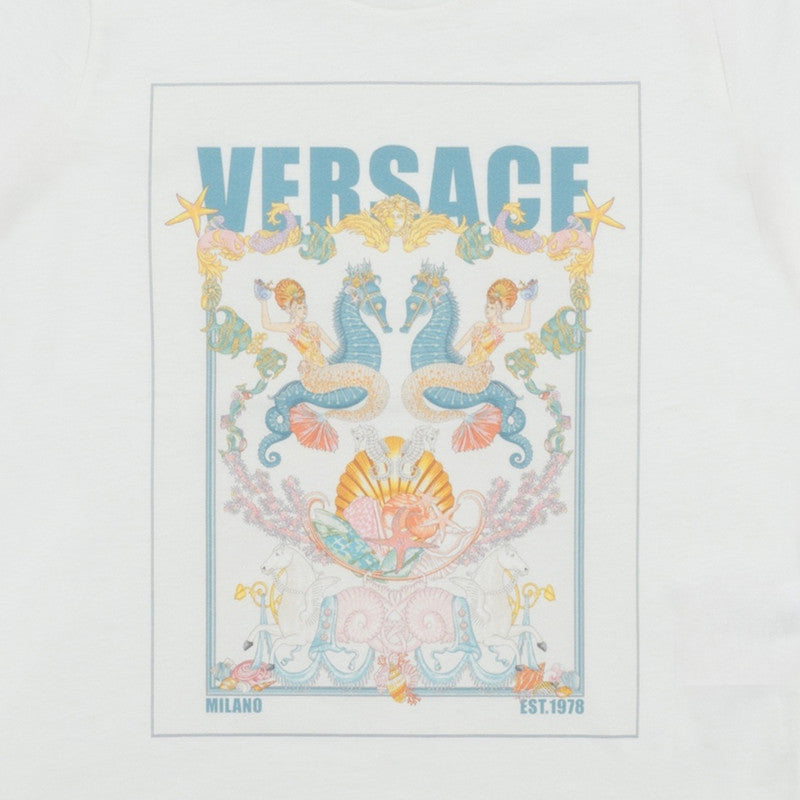 This white T-shirt by luxury brand Versace features a charming seaside postcard-inspired design on the front, with a bold blue logo, sea horses, mermaids and seashells. This casual tee is made in soft cotton jersey, offering comfort and style for everyday wear.